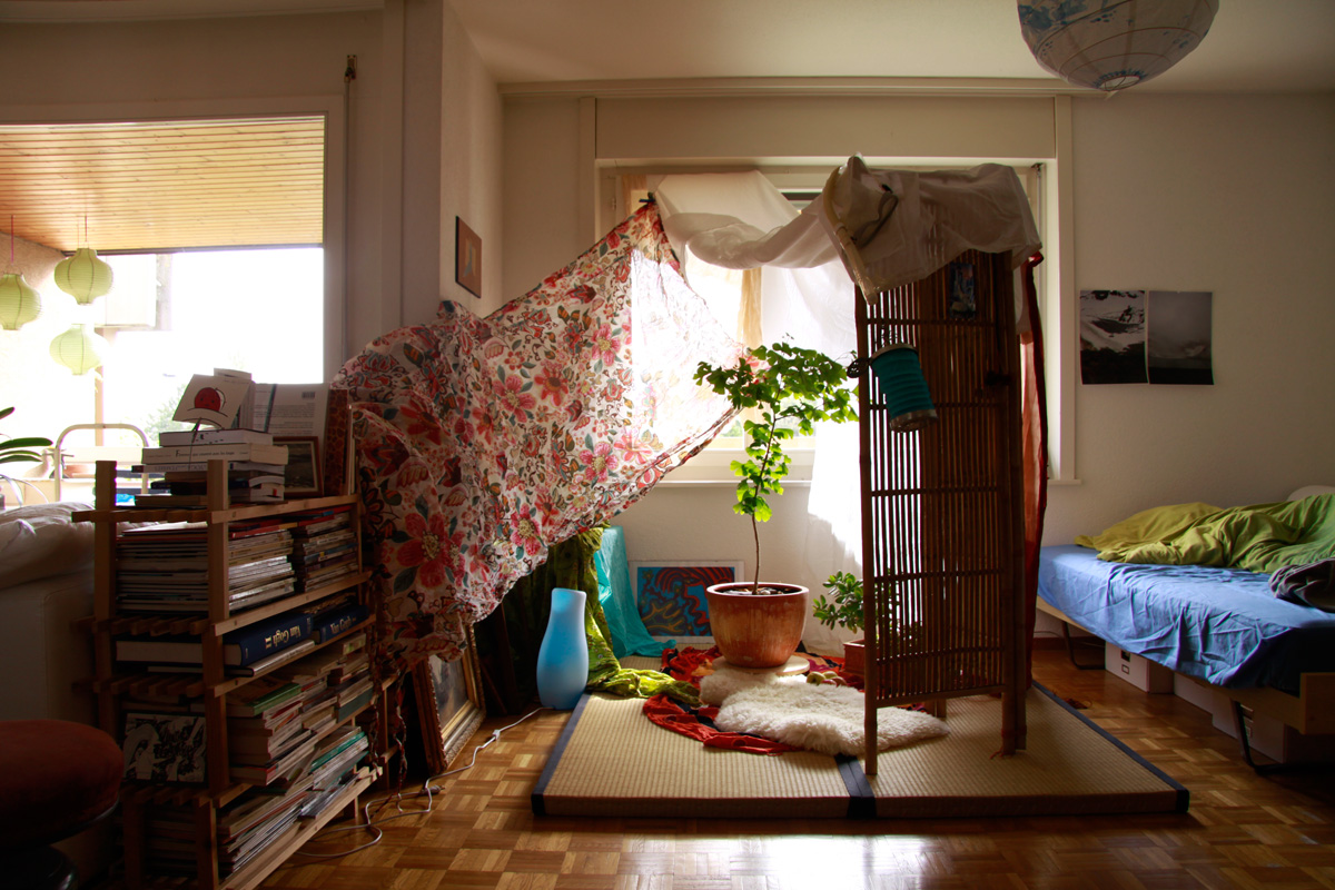 J'invite des personnes de mon entourage à construire une cabane chez eux, avec le matériel à disposition. Il s’agissait de créer un espace autre dans un espace conventionnel, de déranger un intérieur, le modifier pour un instant. Ces cabanes deviennent des décors, des installations et sont ainsi vidées de leur sens.
