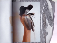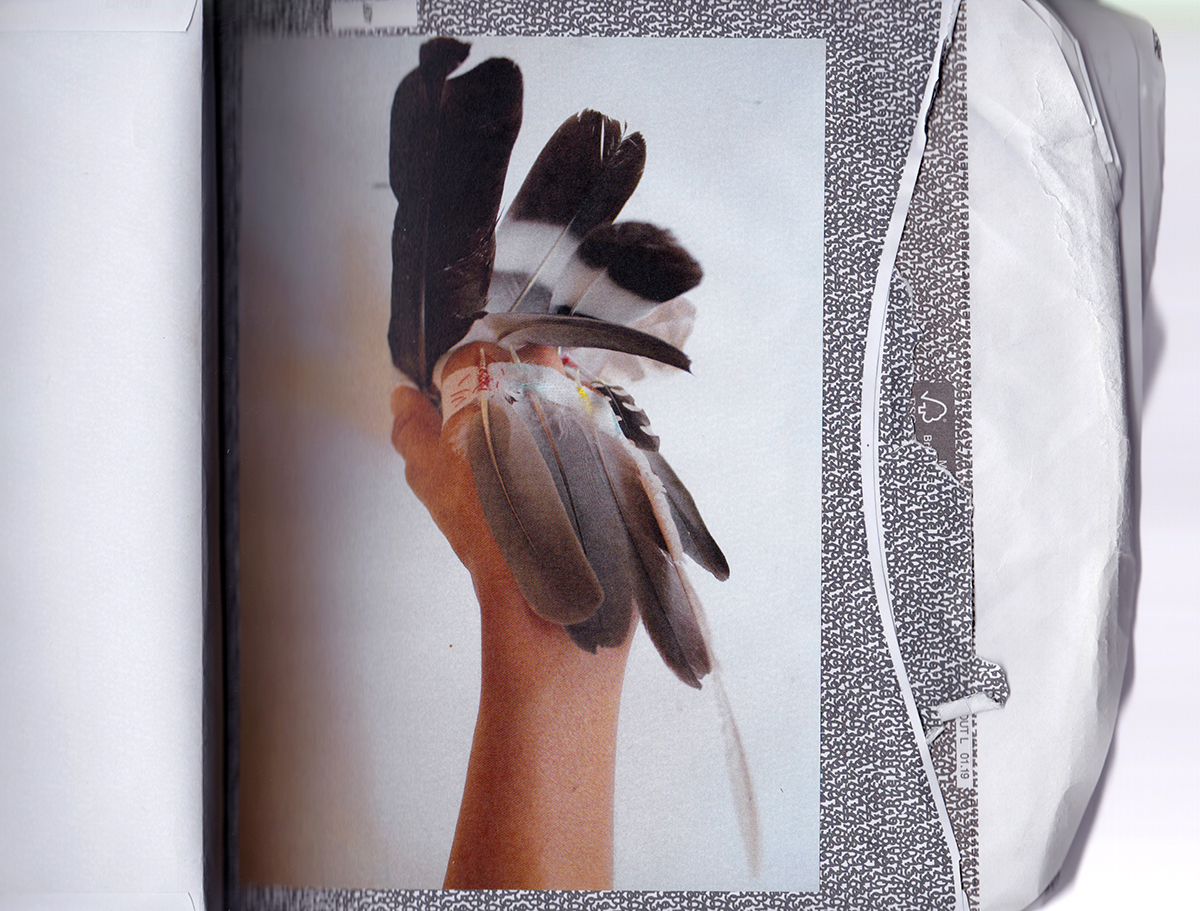 Des enveloppes administratives déchirées rageusement forment les pages sur lesquelles ont été collées des plumes et autres merveilles récoltées lors de balades salvatrices dans la nature.
