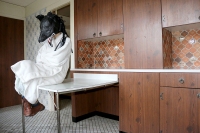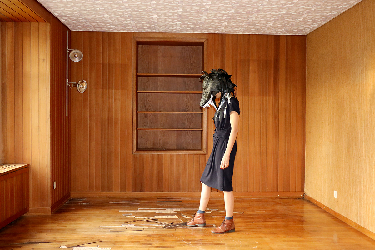 Masque de loup en papier mâché, rêverie et déambulation dans la maison vide de ma grand-mère.L’absence de meubles rend visible et palpable, pour la première fois peut-être, l’usure du temps.